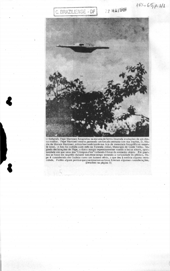 No final dos anos 1960, o governo brasileiro manifestava preocupação com o crescente volume de relatos de aparecimento de objetos voadores não identificados. Embora as autoridades condenassem o que eles chamavam de “vedetismo” (sensacionalismo), diversos órgãos governamentais monitoravam reportagens e matérias da imprensa sobre aparições de OVNI. Em maio de 1969, o Núcleo do Serviço de Informações da Aeronáutica – NSISA produziu um relatório reunindo dezenas de recortes de jornais que noticiavam observações de objetos voadores não identificados em várias partes do Brasil. Na imagem, recorte da edição do jornal Correio Brasiliense de 22 de maio de 1969, em que consta uma suposta fotografia de “disco voador” captada no estado de Goiás. Fundo Objeto Voador Não Identificado. BR_DFANBSB_ARX_65_p0001_0001