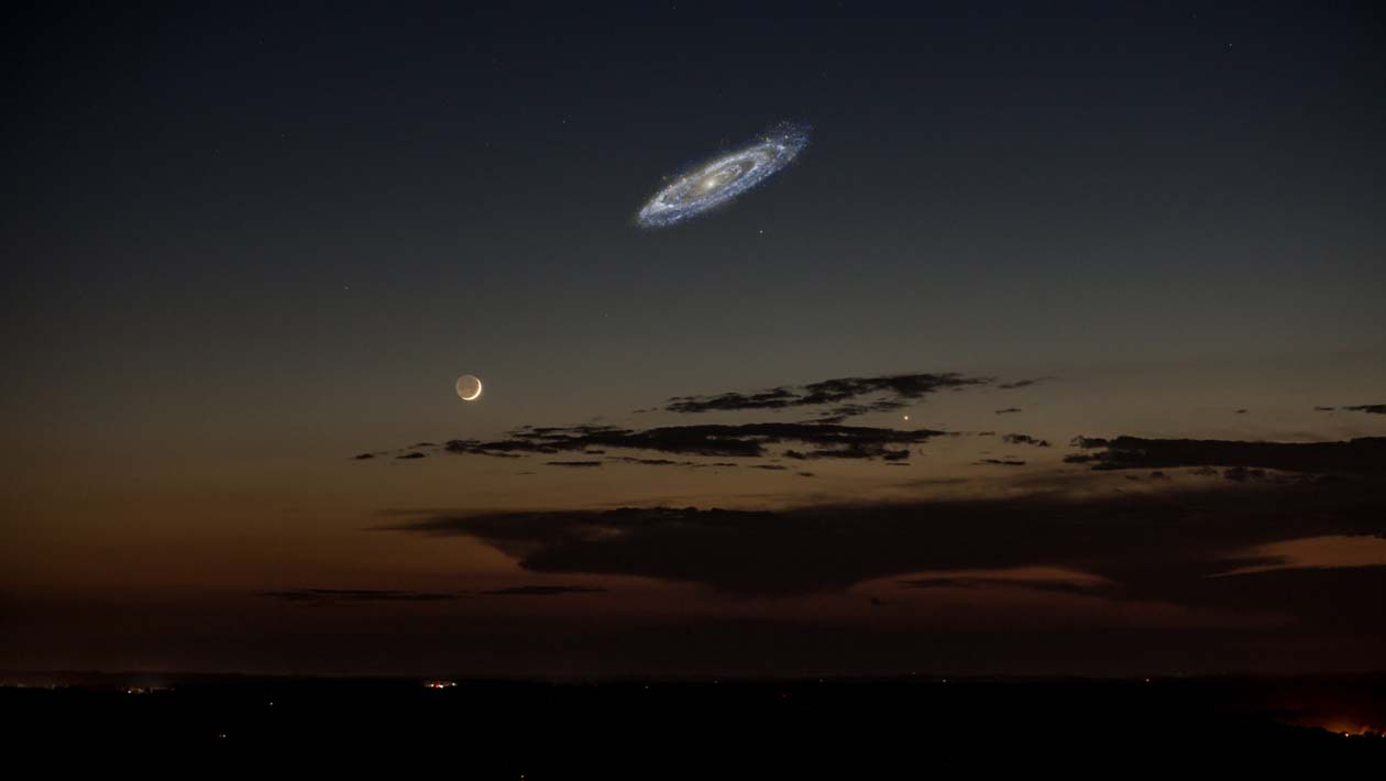 Imagem do topo: É assim que seria a Galáxia de Andrômeda no nosso céu se ela fosse brilhante o suficiente para ser vista a olho nu. Crédito: Tom Buckley-Houston & Stephen Rahn.