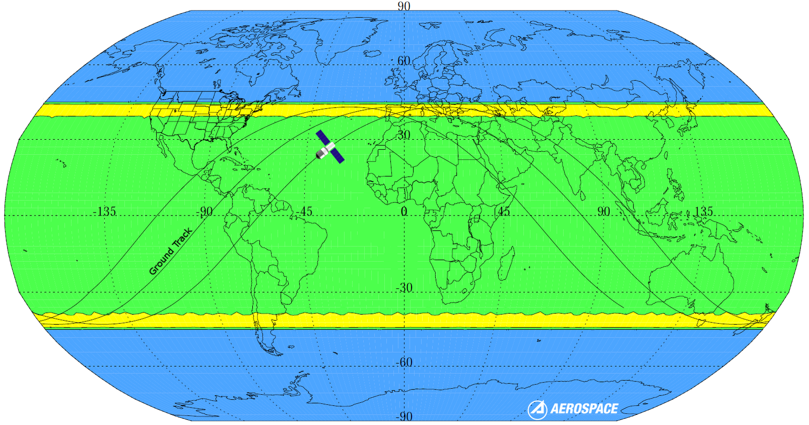 Regiões em amarelo têm maior probabilidade de queda da nave; Áreas em verde têm menor probabilidade; Áreas em azul não tem chance (Foto: Aerospace)